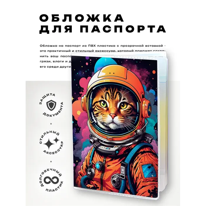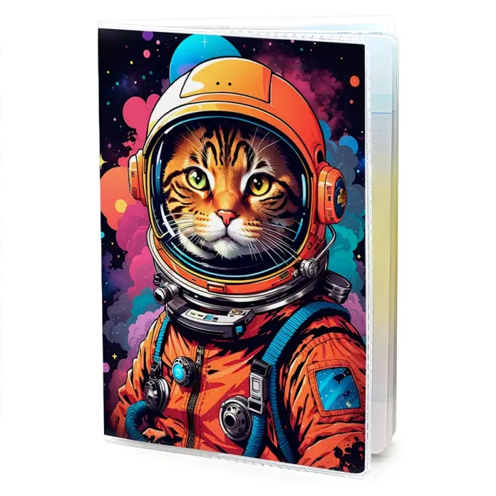 Обложка для паспорта из ПВХ с полиграфическим изображением кота-астронавта.
