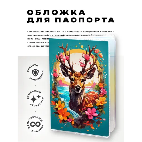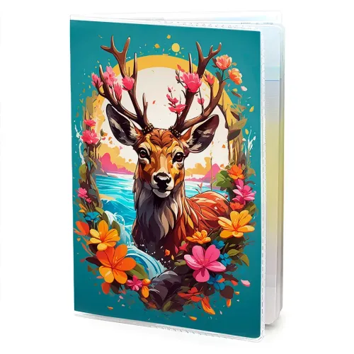 Обложка для паспорта из прозрачного ПВХ пластика с полиграфической вставкой с изображением оленя и цветов.