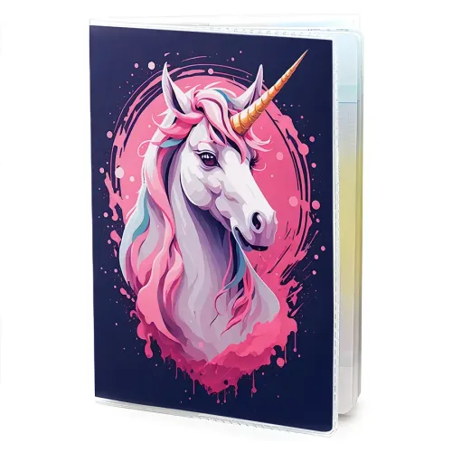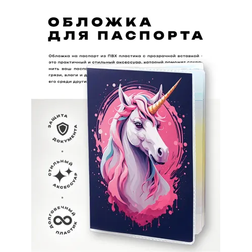 Обложка для паспорта из прозрачного ПВХ пластика с полиграфической вставкой с изображением единорога.