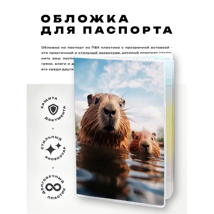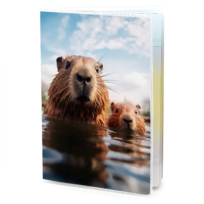Обложка для паспорта из прозрачного ПВХ пластика с полиграфической вставкой с изображением капибары.