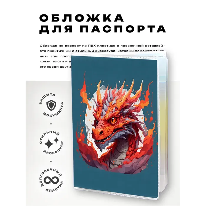 Обложка для паспорта из прозрачного ПВХ пластика с полиграфическим изображением дракона.