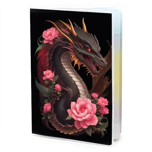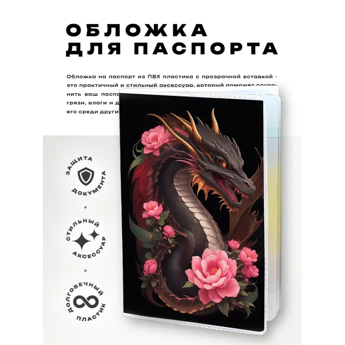 Обложка для паспорта из прозрачного ПВХ пластика с изображением дракона и роз.