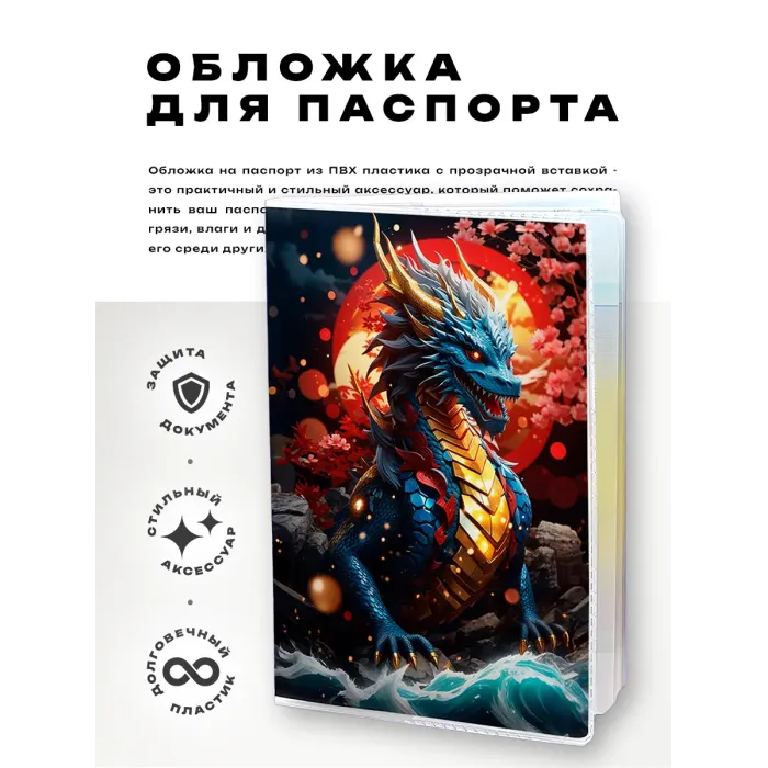 Обложка для паспорта с изображением Восточного дракона — это не только практичный аксессуар, но и символ удачи и силы. Изготовленная из прозрачного ПВХ пластика, она защищает паспорт от повреждений и загрязнений. Полиграфическая вставка придаёт изделию уникальный стиль, а упаковка в полипропиленовый пакет с вырубкой под еврокрючок делает её удобной для хранения и продажи. Это отличный выбор как для личного использования, так и в качестве подарка.