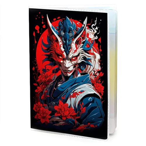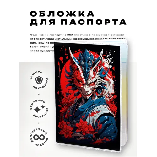 Обложка для паспорта из прозрачного ПВХ пластика с полиграфической вставкой с изображением японской маски демона.