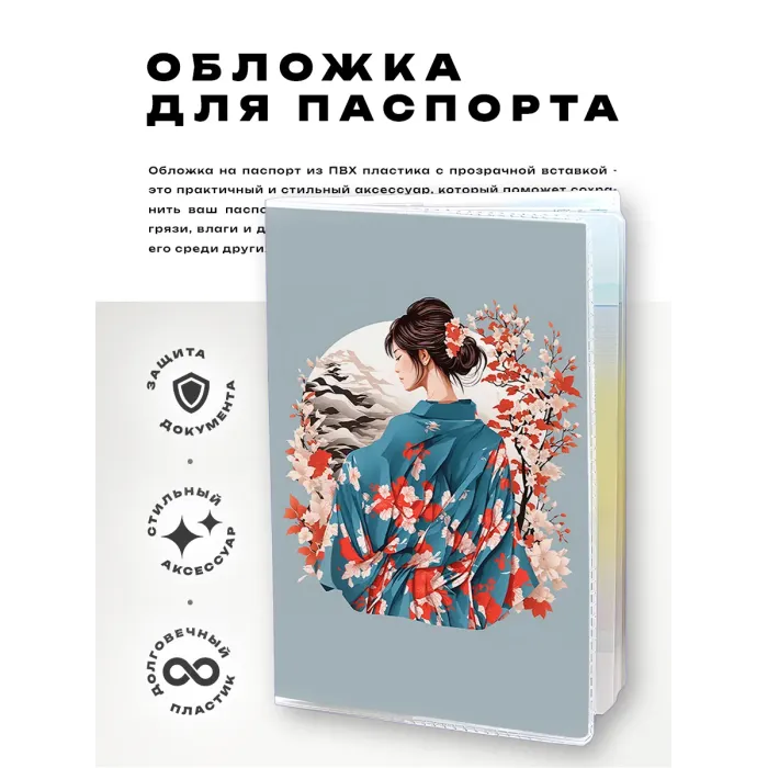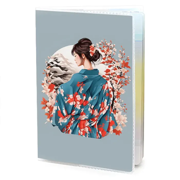 Обложка для паспорта из прозрачного ПВХ пластика с полиграфической вставкой с изображением японской девушки.