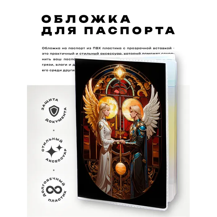 Обложка для паспорта выполнена из прозрачного ПВХ пластика, что обеспечивает надежную защиту документа от повреждений и загрязнений. Элегантный дизайн с полиграфической вставкой в виде ангельской пары добавляет уникальности и стиля. Упаковка в полипропиленовый пакет с вырубкой под еврокрючок делает товар удобным для хранения и демонстрации. Этот аксессуар станет не только практичным, но и красивым дополнением к личным вещам, подчеркивая индивидуальность владельца.