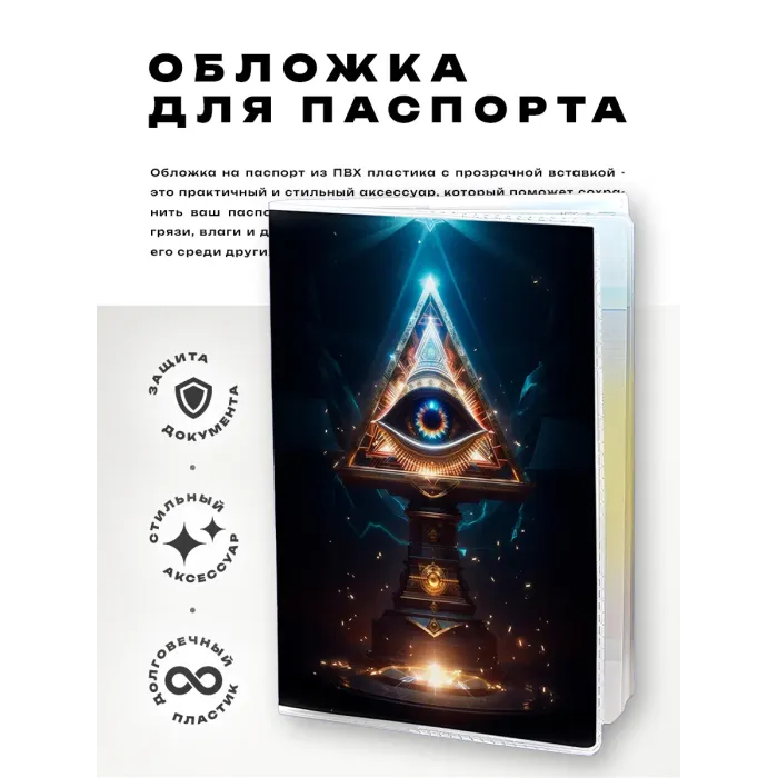 Обложка для паспорта, выполненная из прозрачного ПВХ пластика, сочетает в себе стильный дизайн и практичность. Полиграфическая вставка с изображением Всевидящего ока придаёт изделию уникальность и символический смысл, ассоциирующийся с защитой и вниманием к деталям. Упаковка в полипропиленовый пакет с вырубкой под еврокрючок делает обложку удобной для хранения и продажи. Идеальный аксессуар для сохранности паспорта в любом путешествии или повседневной жизни.