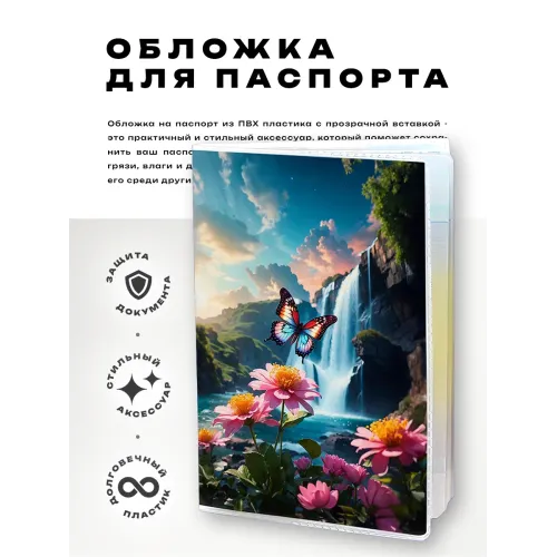 Обложка для паспорта из прозрачного ПВХ пластика — это стильный и практичный аксессуар, который не только защищает документ от повреждений, но и добавляет яркости в повседневную жизнь. Полиграфическая вставка с изображением бабочки на фоне водопада придаёт уникальность и выразительность. Упаковка в полипропиленовый пакет с вырубкой под еврокрючок делает её удобной для хранения и транспортировки. Такой аксессуар станет отличным подарком или дополнением к личным вещам.