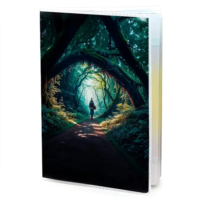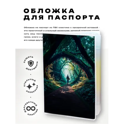 Обложка для паспорта из прозрачного ПВХ пластика с полиграфической вставкой с изображением аллеи в лесу.