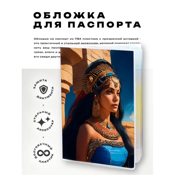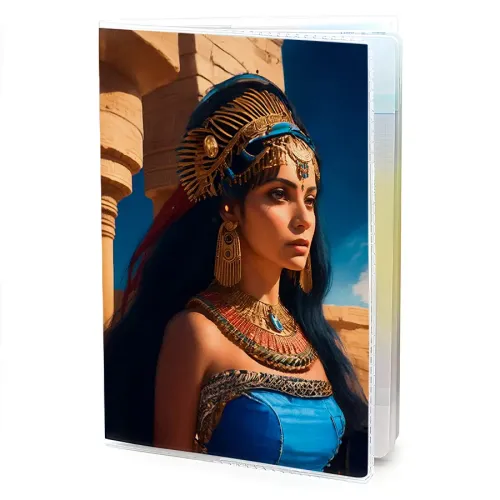 Обложка для паспорта из прозрачного ПВХ пластика с полиграфической вставкой с изображением Клеопатры.