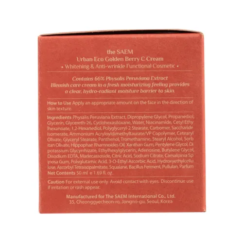Крем для лица Urban Eco Golden Berry C Cream от The Saem содержит 66% экстракта перуанской золотой ягоды (физалиса), который помогает уменьшить образование морщин и пятен, а также обладает осветляющим эффектом. Этот крем насыщает кожу витаминами A и C, обеспечивая ей необходимое питание и увлажнение. Средство оказывает успокаивающее действие на кожу, улучшая её текстуру и тонус.