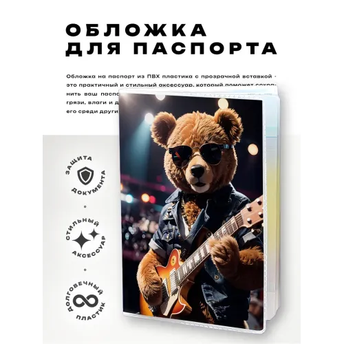 Обложка для паспорта из прозрачного ПВХ пластика с полиграфической вставкой, изображающей медвежонка Тедди с гитарой.