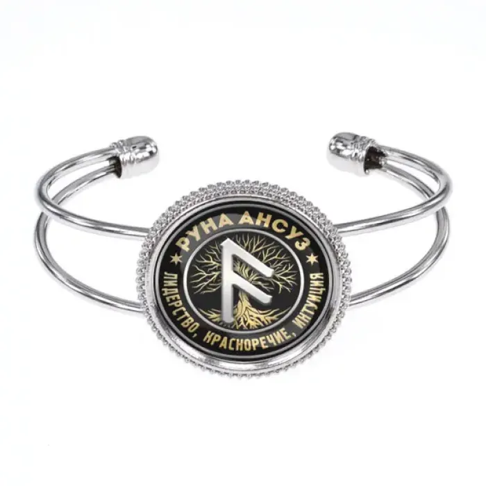 Браслет с символом руны Ансуз. Изготовлен из бижутерного сплава с покрытием под серебро, имеет открытую форму.