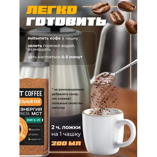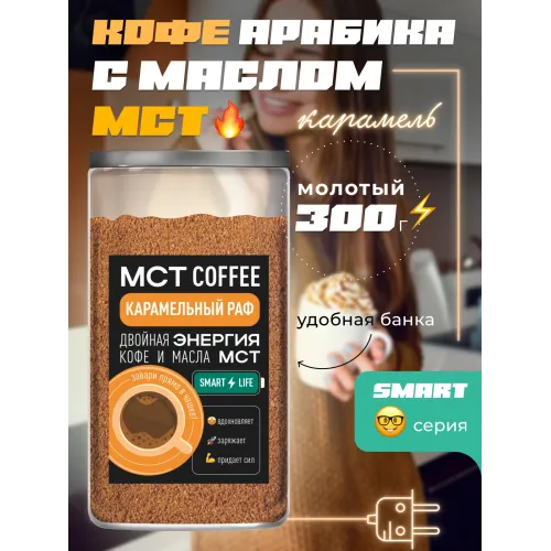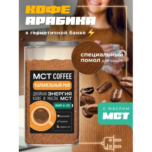 Десертный кофе Madeo Smart «Карамельный раф» — это молотый кофе на основе арабики из Латинской Америки с добавлением натурального кокосового МСТ-масла (Medium Chain Triglycerides — среднецепочечные триглицериды). Средняя обжарка раскрывает мягкий, сливочный вкус с выраженными нотами карамели и кокоса. Напиток обладает низкой кислотностью, плотным телом и сбалансированной горчинкой.