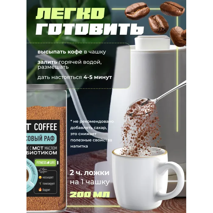 Состав: Арабика, кокосовое масло с высоким содержанием МСТ (Medium Chain Triglycerides — триглицериды средней цепи)
