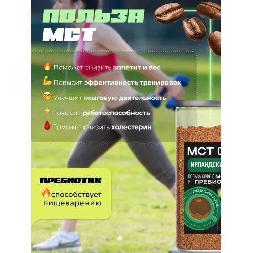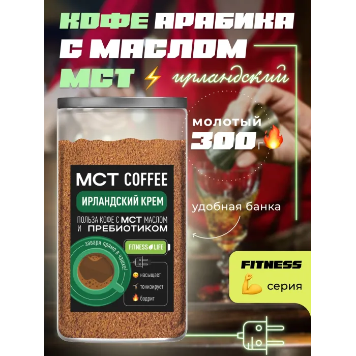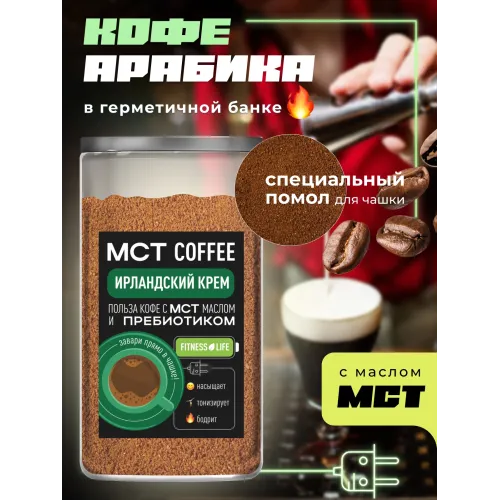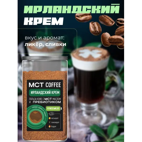 Десертный молотый кофе Madeo МСТ Fitness Ирландский крем — это ароматизированный напиток на основе арабики средней обжарки с добавлением масла МСТ из кокоса. Вкус сбалансирован с нотами молока, ликёра и кокоса, которые создают сливочное послевкусие. Плотность высокая, кислотность низкая, горечь средняя.