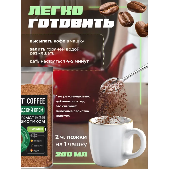 Особенности: Содержит масло МСТ (Medium Chain Triglycerides — среднецепочечные триглицериды) из кокоса.