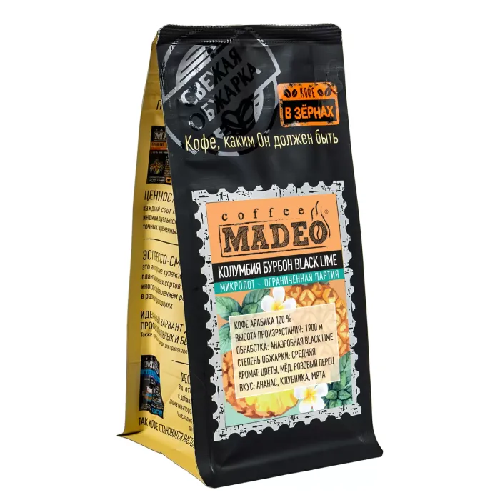 Плантационный молотый кофе Madeo из Колумбии — это уникальный микрлот, прошедший двойную анаэробную обработку black lime. Вкус чистый и сладкий, с яркими нотами ананаса и клубники, завершающимися освежающим послевкусием мяты. Аромат нежный, цветочный, с оттенками летнего мёда и розового перца.