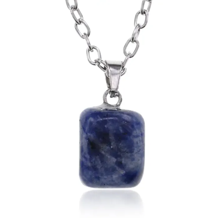 Кулон с натуральным камнем содалит в металлической оправе с регулируемой цепочкой.