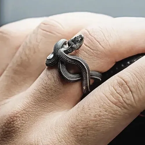 Безразмерное кольцо в виде змеи из металла с серебристым покрытием.