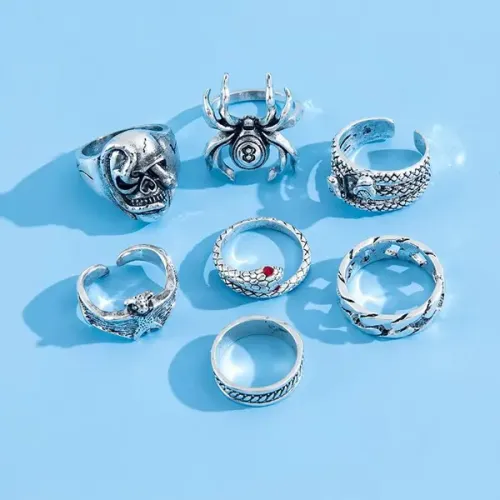 Набор из семи ювелирных колец. Материал — металл с серебряным покрытием и вставками из страз.