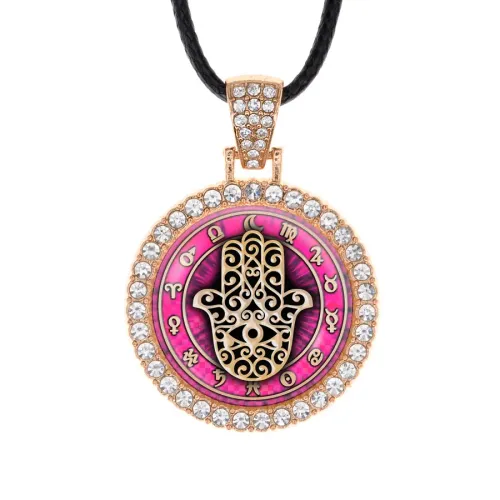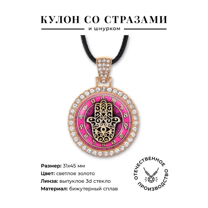 Кулон-амулет Хамса из бижутерного сплава со стразами и стеклянной линзой.