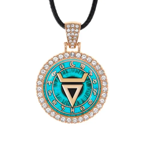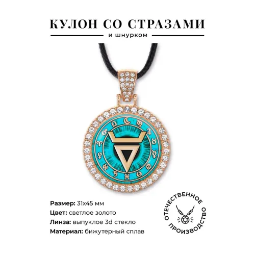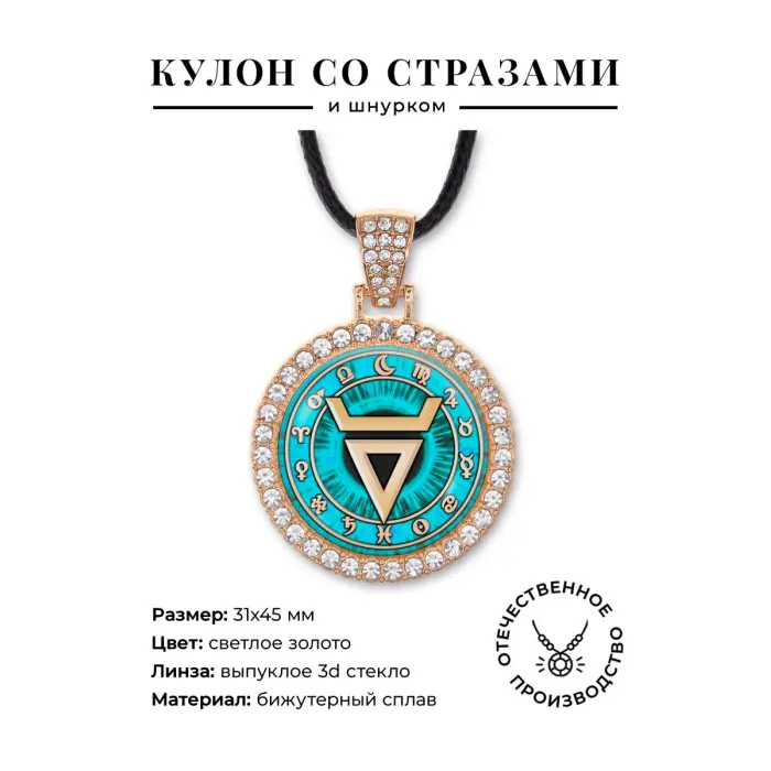 Кулон из бижутерного сплава в виде символа Велеса, инкрустированный стразами и защищённый стеклянной линзой.