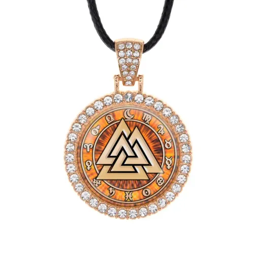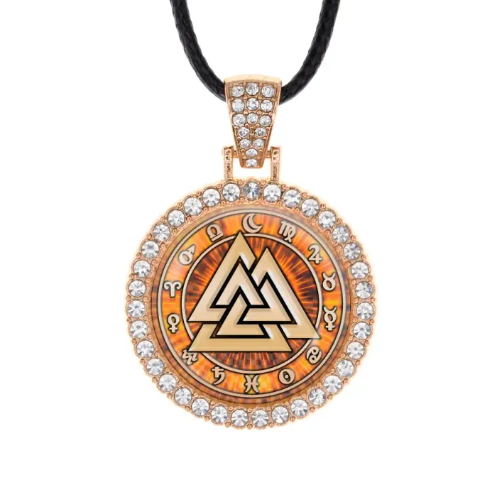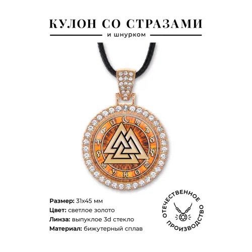 Кулон Валькнут из бижутерного сплава со стразами и стеклянной линзой.