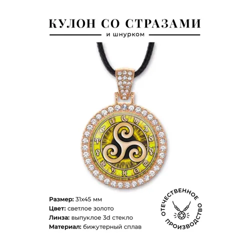Кулон со стразами в виде символа трискель. Изготовлен из бижутерного сплава с покрытием под светлое золото и инкрустирован стразами.