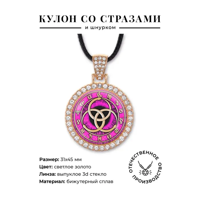 Материал и изготовление: Бижутерный сплав с покрытием под светлое золото, инкрустация стразами, защита изображения выпуклой стеклянной линзой.