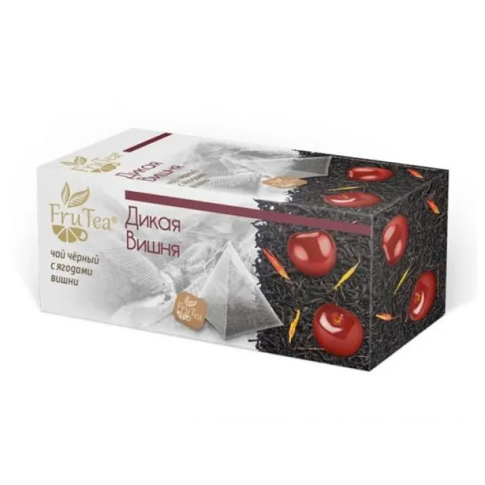 FruTea «Дикая вишня» — это черный среднелистовой чай с добавлением кусочков вишни, листьев ежевики и чёрной смородины, а также лепестков сафлора. Пирамидки обеспечивают идеальные условия для заваривания, позволяя вкусу и аромату чая раскрыться полностью.