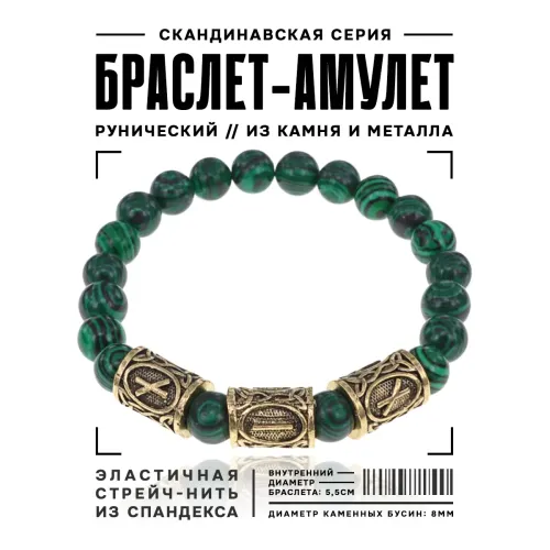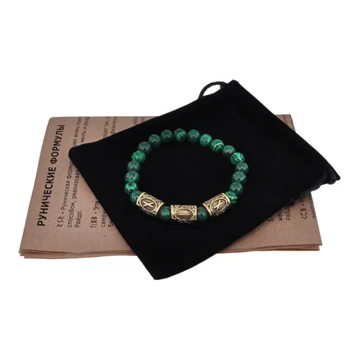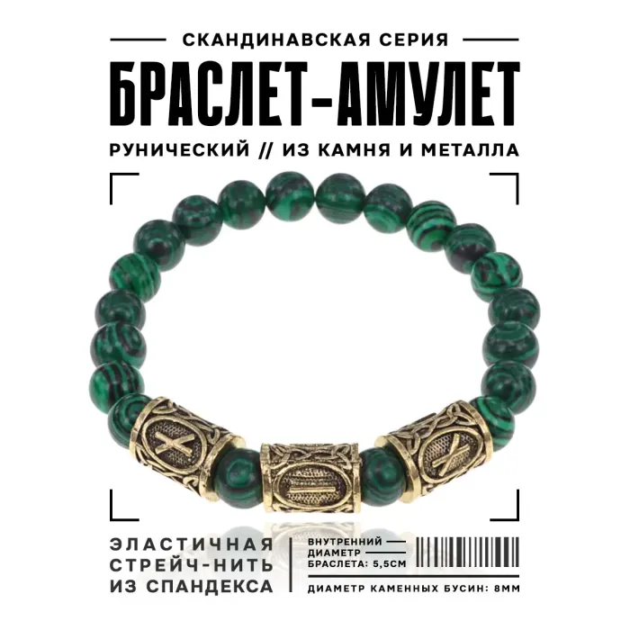 Рунический стрейч-браслет с бусинами из синтетического малахита диаметром 8 мм. Украшен символами рун Наутиз и Иса.