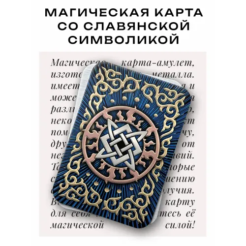 Славянская магическая карта, выполненная из металла толщиной 0,45 мм. Размер карты составляет 56х80 мм. Упакована в прозрачный пакетик с описанием. Эта карта является символом сущности бытия и первоосновой мирового порядка. Окружность на карте служит знаком защиты, а внутри ромб олицетворяет Мать Сырую Землю и переплетение нитей судеб. Звезда Руси выступает как охранный и защитный оберег, традиционно используемый для привлечения удачи и гармонии в жизнь.