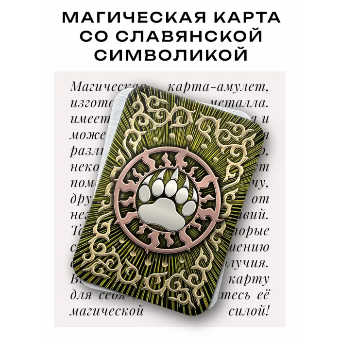 Славянская магическая карта, выполненная из металла толщиной 0,45 мм, станет прекрасным дополнением к любому интерьеру и источником вдохновения. Размер карты составляет 56х80 мм, что делает её удобной для ношения или размещения на видном месте. Упакована в прозрачный пакетик с описанием, она идеально подходит как для личного использования, так и в качестве подарка. Символ Печать Велеса (Медвежья лапа) — это древний славянский талисман, который традиционно используется для привлечения удачи и процветания. Он дарует благополучие и защищает от отрицательной энергетики.