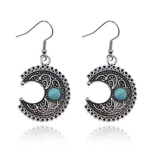 Серьги в форме полумесяца из металла с покрытием под серебро и вставками из синтетической бирюзы.