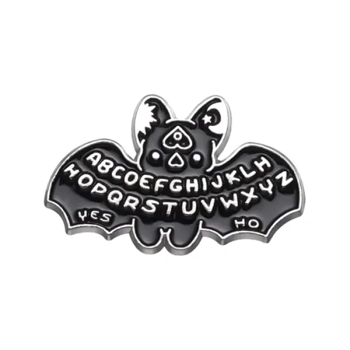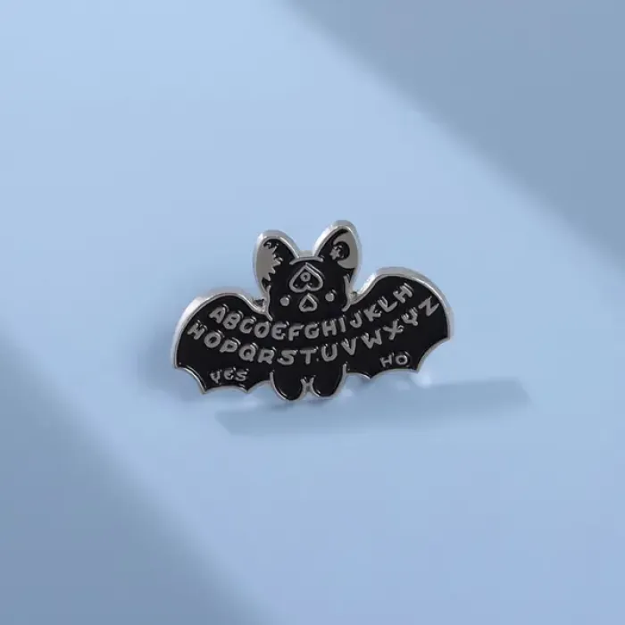 Металлический значок с эмалевым покрытием в форме летучей мыши.
