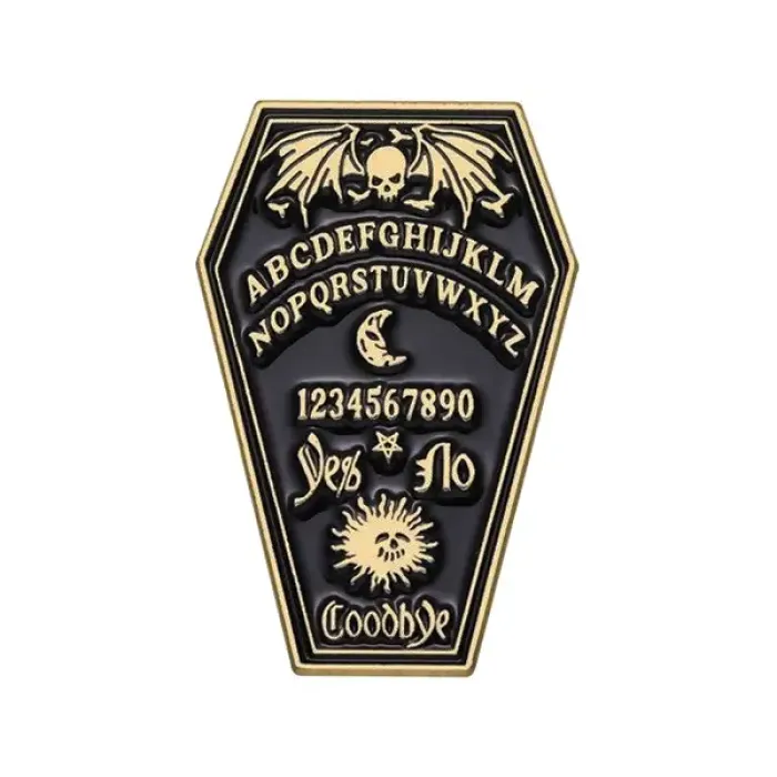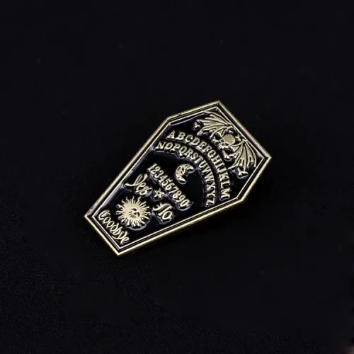Металлический значок сувенирного назначения в форме гроба.