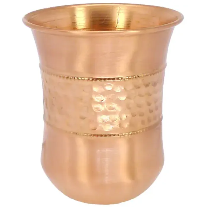 Стакан изготовлен из цельного листа меди. Материал обладает антибактериальными свойствами. Конструкция представляет собой цилиндрический сосуд без дополнительных ручек или декоративных элементов.