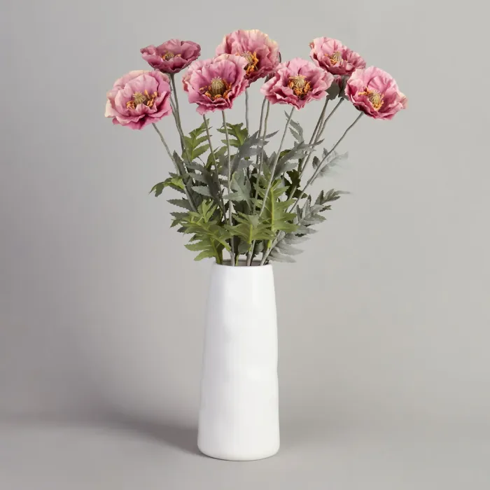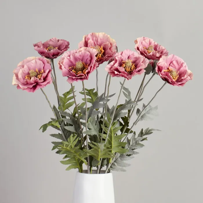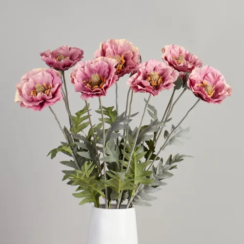 Искусственный мак прекрасно сочетается с другими декоративными элементами, добавляя яркости и уюта любому пространству. Подходит для использования в местах с ограниченным освещением, таких как прихожие или ванные комнаты. Регулярная очистка от пыли обеспечит сохранение эстетического вида на долгое время.