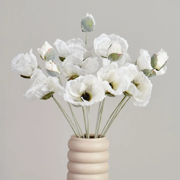Искусственный мак легко сочетается с другими декоративными элементами благодаря своей универсальности. Он сохраняет эстетичный вид длительное время при условии регулярной очистки от пыли. Избегать следует прямого солнечного света во избежание выгорания цвета.