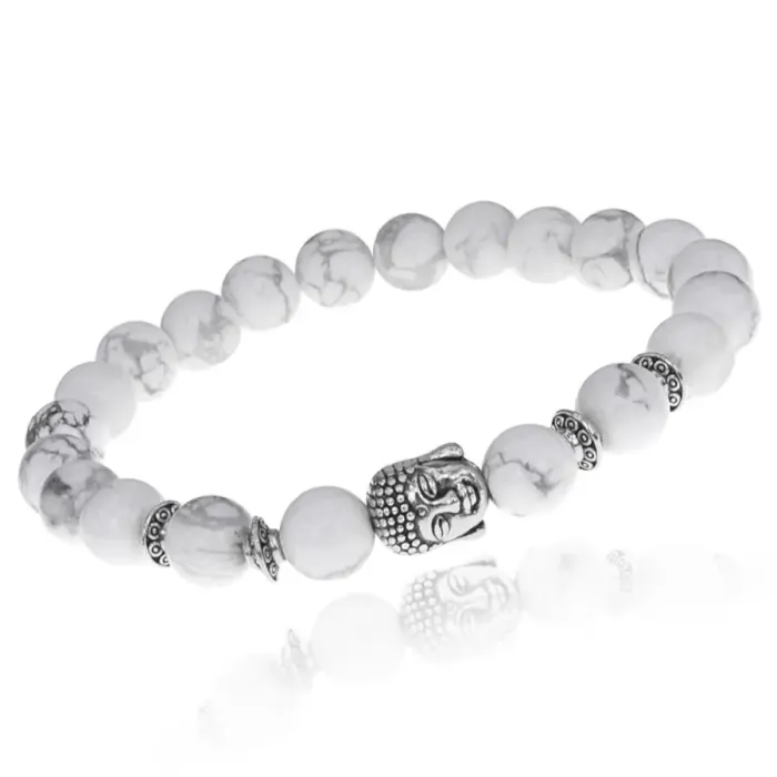 Материал и изготовление: Бусины из натурального камня кахолонг диаметром 8 мм. Декоративная бусина с изображением головы Будды изготовлена из бижутерного сплава с покрытием под серебро.