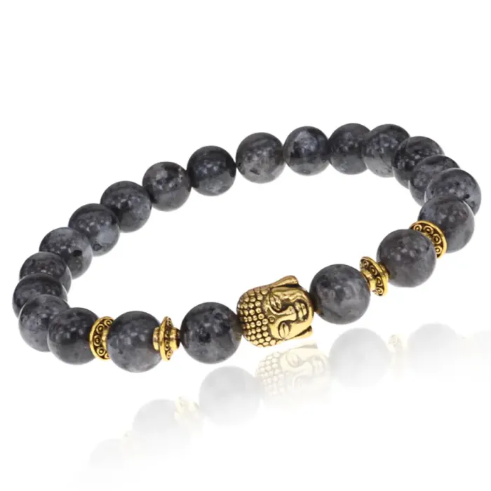 Стрейч-браслет с бусинами из лабрадора и декоративным элементом в виде головы Будды.