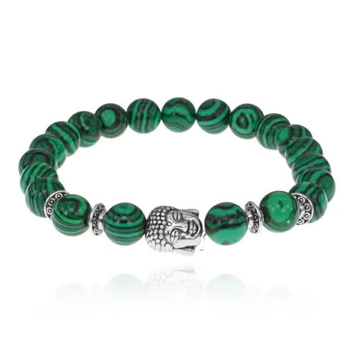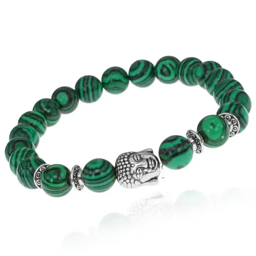 Стрейч-браслет с бусинами в виде головы Будды и синтетическим малахитом.