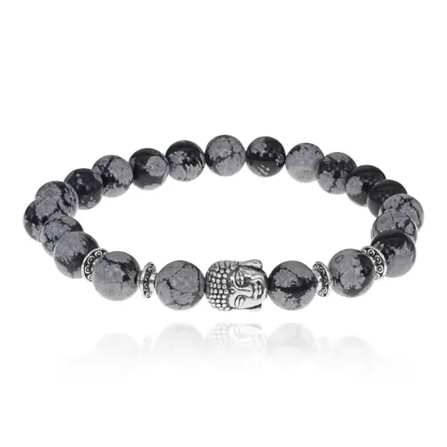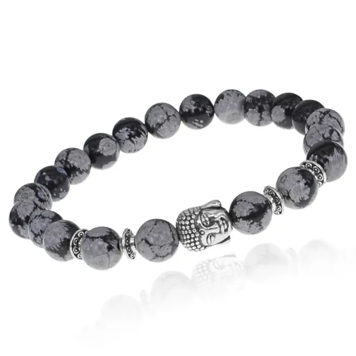 Браслет-амулет Будда с нат. камнем Снежный обсидиан 8мм BSHE-01-14S