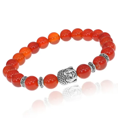 Стрейч-браслет с внутренним диаметром около 5,5 см и бусинами из натурального сердолика диаметром 8 мм. Бусины изготовлены из бижутерного сплава с покрытием под серебро. Голова Будды символизирует мудрость, просветление и внутренний покой, напоминая о важности духовного развития и гармонии. Ассоциируется с пробуждением сознания и пониманием истинной природы бытия. Сердолик традиционно используется для защиты от негативной энергии, дарует храбрость и помогает достигать новых высот в жизни.