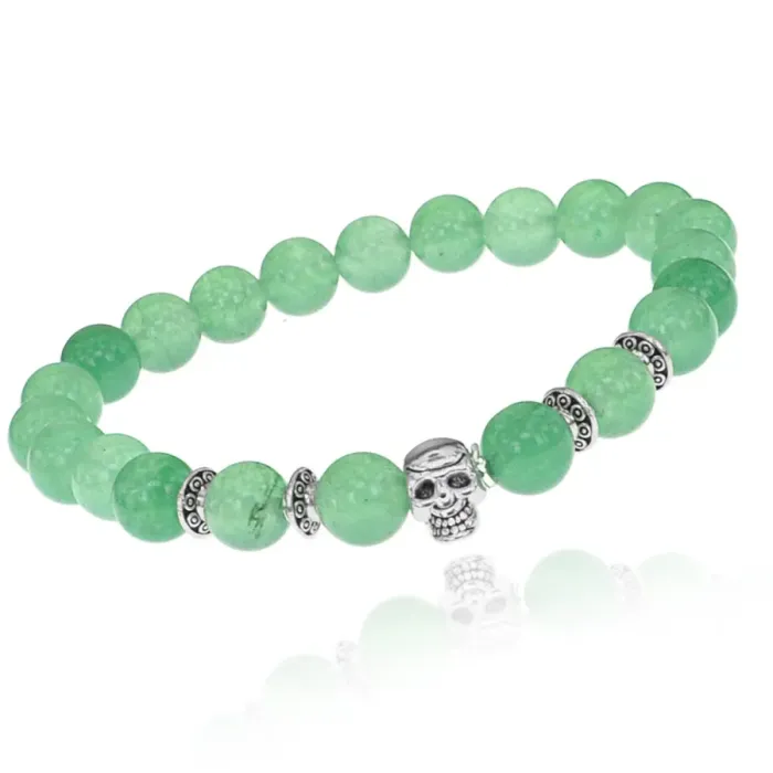 Стрейч-браслет из бижутерного сплава с центральным элементом в виде черепа и бусинами из нефрита.