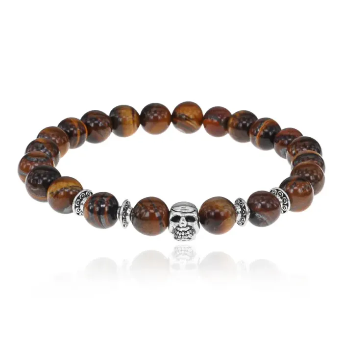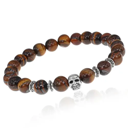 Браслет-амулет Череп с нат.камнем Тигровый глаз 8мм BSHE-02-19S