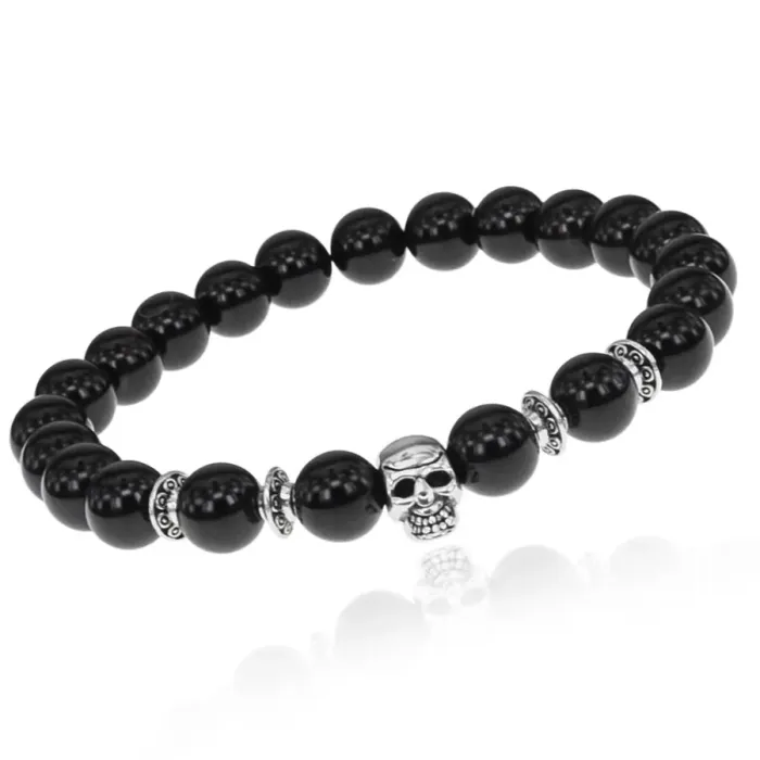 Браслет-амулет Череп с нат. камнем Черный агат 8мм BSHE-02-23S