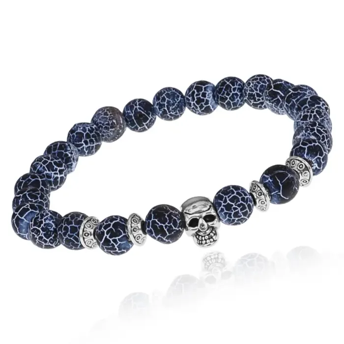 Браслет-амулет Череп с нат. камнем синий Африканский агат 8мм BSHE-02-27S