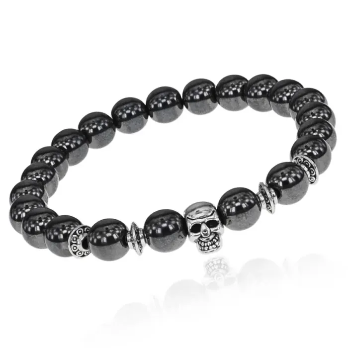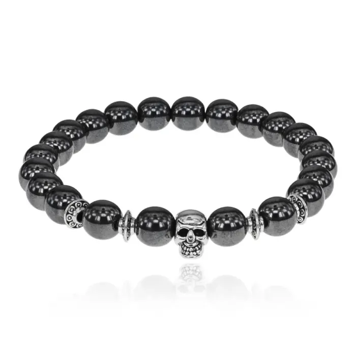 Браслет-амулет Череп с синт. камнем Гематит (не магнит.) 8мм BSHE-02-28S